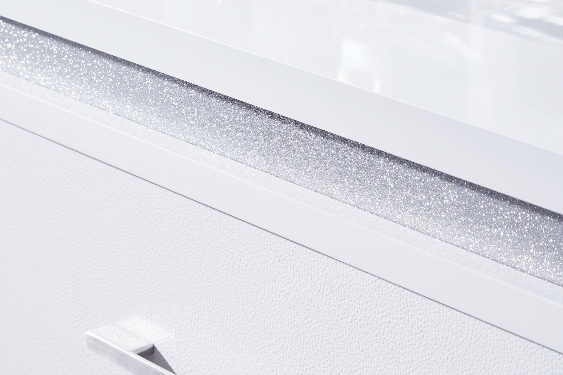 | Details | Made with hardwood solids and MDF substrates, White paint finish, Inset acrylic glitter accents, Horizontal metal drawer pulls, 6 drawers with fully finished interiors, dovetail construction and heavy duty ball-bearing side glides, Textured drawer fronts | |