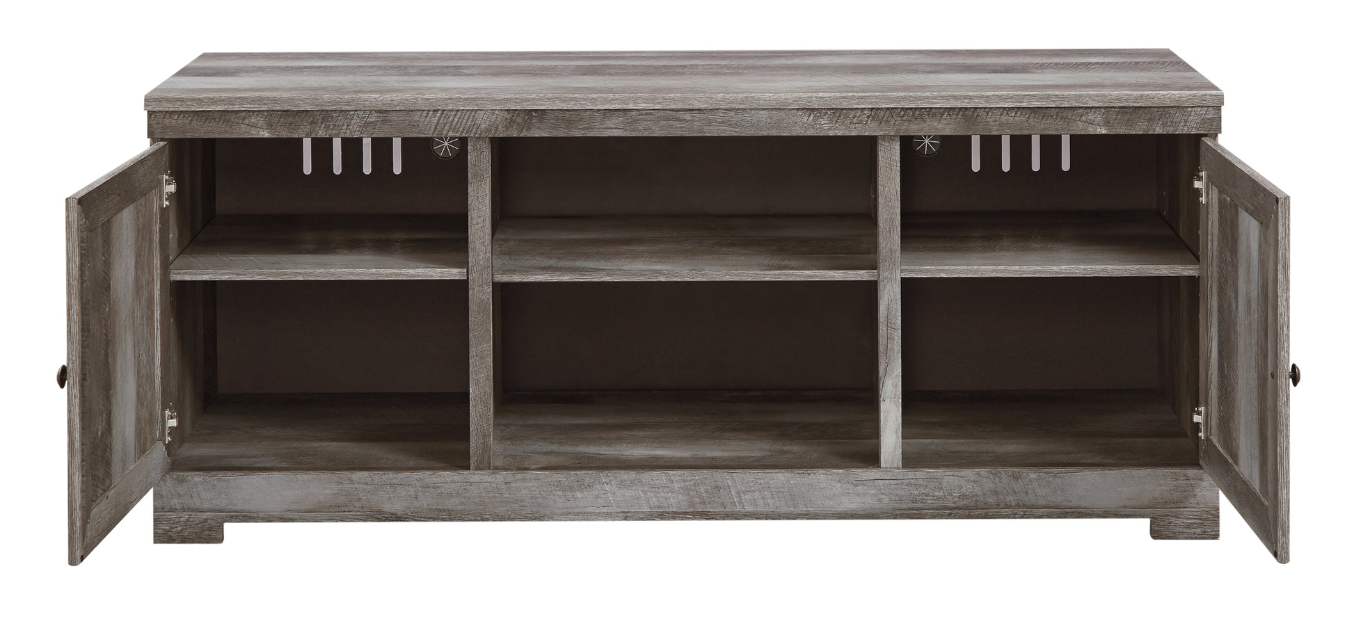 | Details | Includes TV stand and electric fireplace insert (W100-02), Made with engineered wood (MDF/particleboard), Rustic gray finish over replicated oak grain, Plank effect, 2 storage cabinets (each with an adjustable shelf), Removable/adjustable center shelf, Cutouts for wire management and ventilation, Electric fireplace insert provides up to 4,608 BTU/1,400W and warms up to 400 square feet (heats a mid-size room) , 6-level temperature setting; 5 levels of flame brightness; overheating control device, LED-lit flame operates with or without heat; option for placing faux glass crystals or stones (included), Remote control with LED display, Power cord included; UL Listed, Assembly required; simply remove the center shelf and back panel to make room for the fireplace insert | |